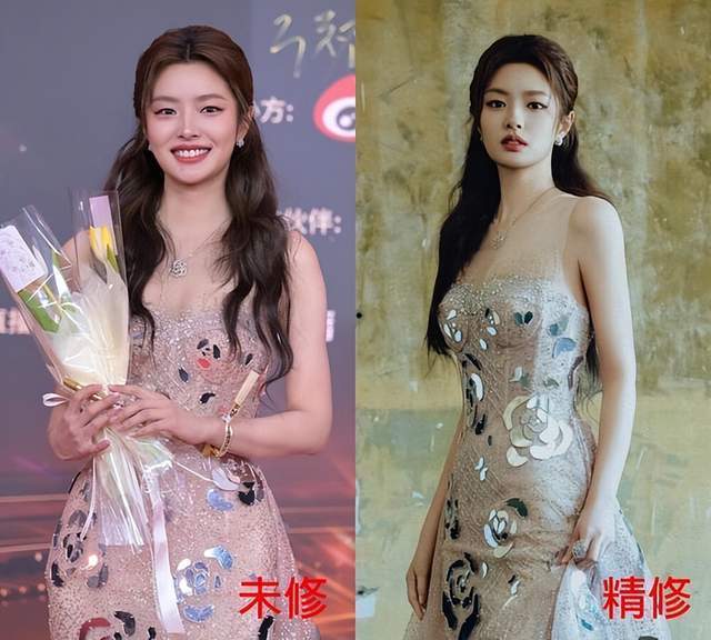 要说最打脸的还是精修图。工作室发的照片里,白鹿直角肩天鹅颈,宋祖儿腰细得能盈盈一握,周也皮肤通透得像剥壳鸡蛋。可现场生图呢?直角肩变溜肩,小蛮腰藏赘肉,磨皮磨到五官都模糊了。更离谱的是,有的团队连手边缘都P成波浪线,生怕别人不知道“照骗”真相。难怪网友锐评:“现在的精修图,比电视剧特效还假!”